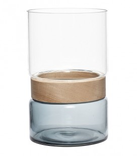 Vase modulable en 3 parties, un fond en verre, un cerclage en bois d'acacia à positionner par-dessus et une dernière partie avec un col supplémentaire en verre.