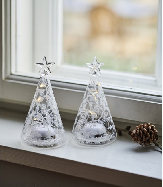 Set de 2 sapins design en verre avec guirlande LED intégrée, de la gamme Cozy de Sirius. En verre transparent orné de dessins fins de ramage, ils invitent douceur et esprit de Noël dans votre intérieur.